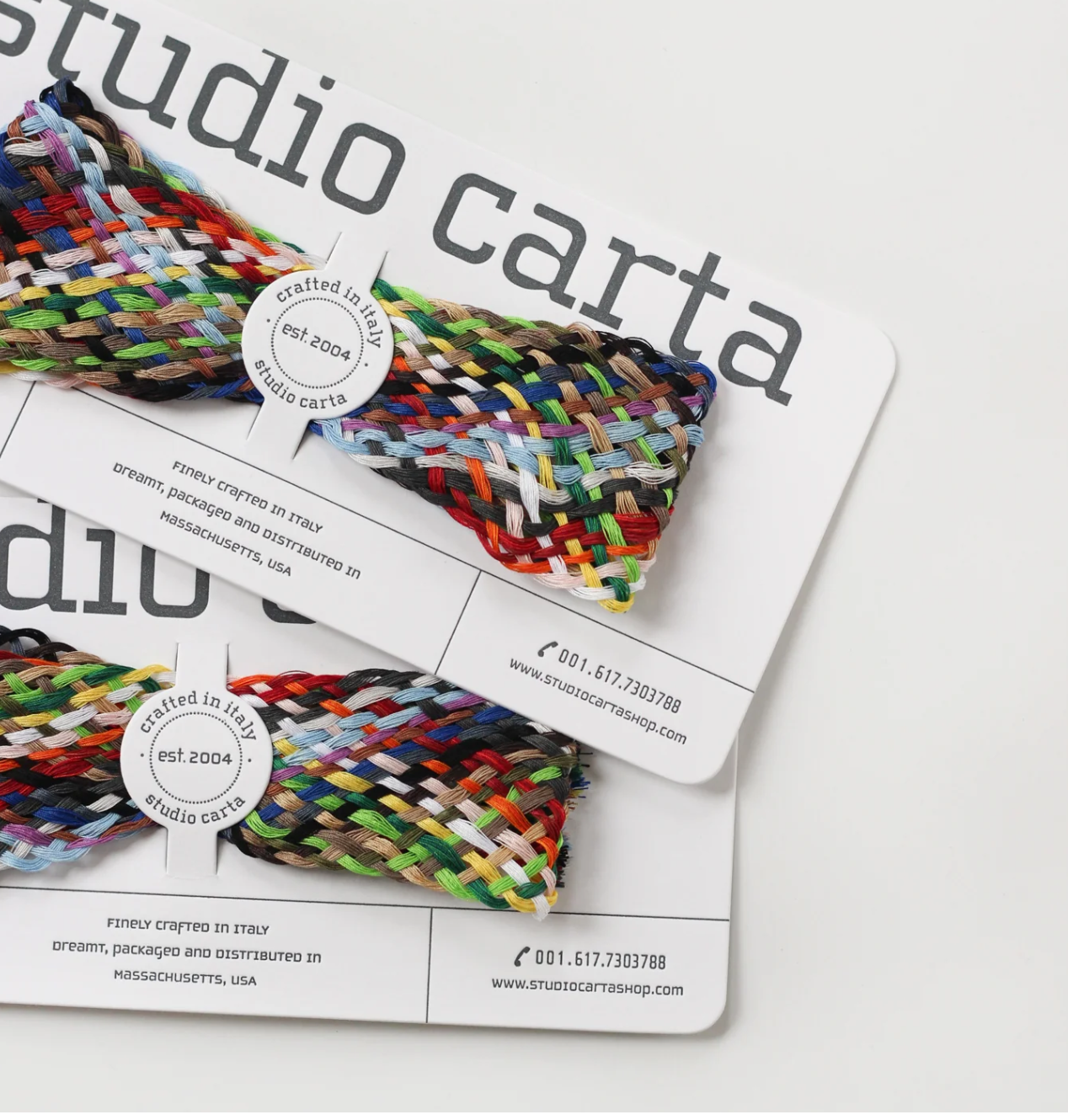 Introducing braided cotton thread from Italy; made to slip in your suitcase for travel or smaller projects on the go. Each braid comes in a multitude of 25 colors. Simply pull gently on the color you’d like to use, and it will slip out with ease from the larger braid of threads. Magic!